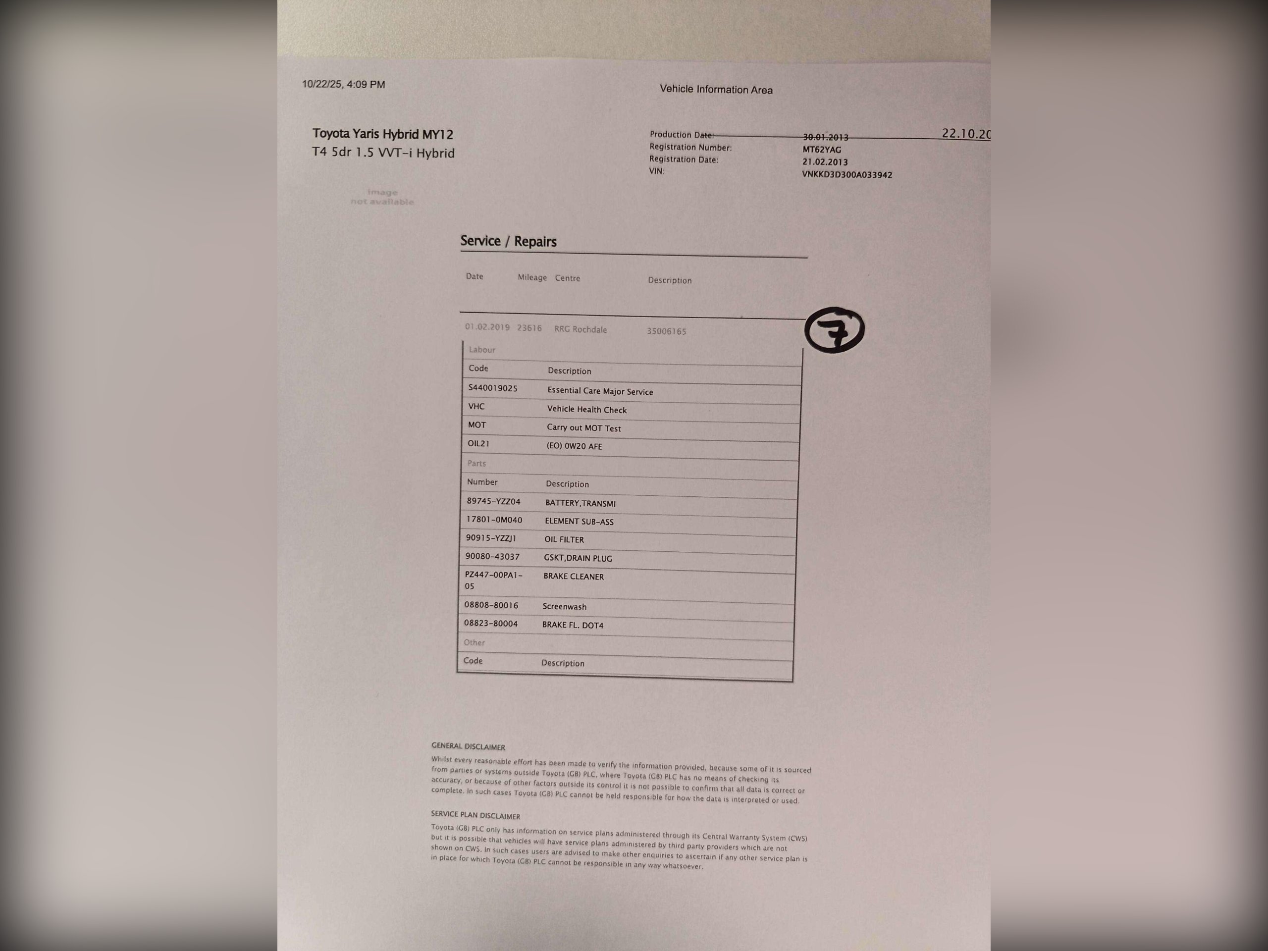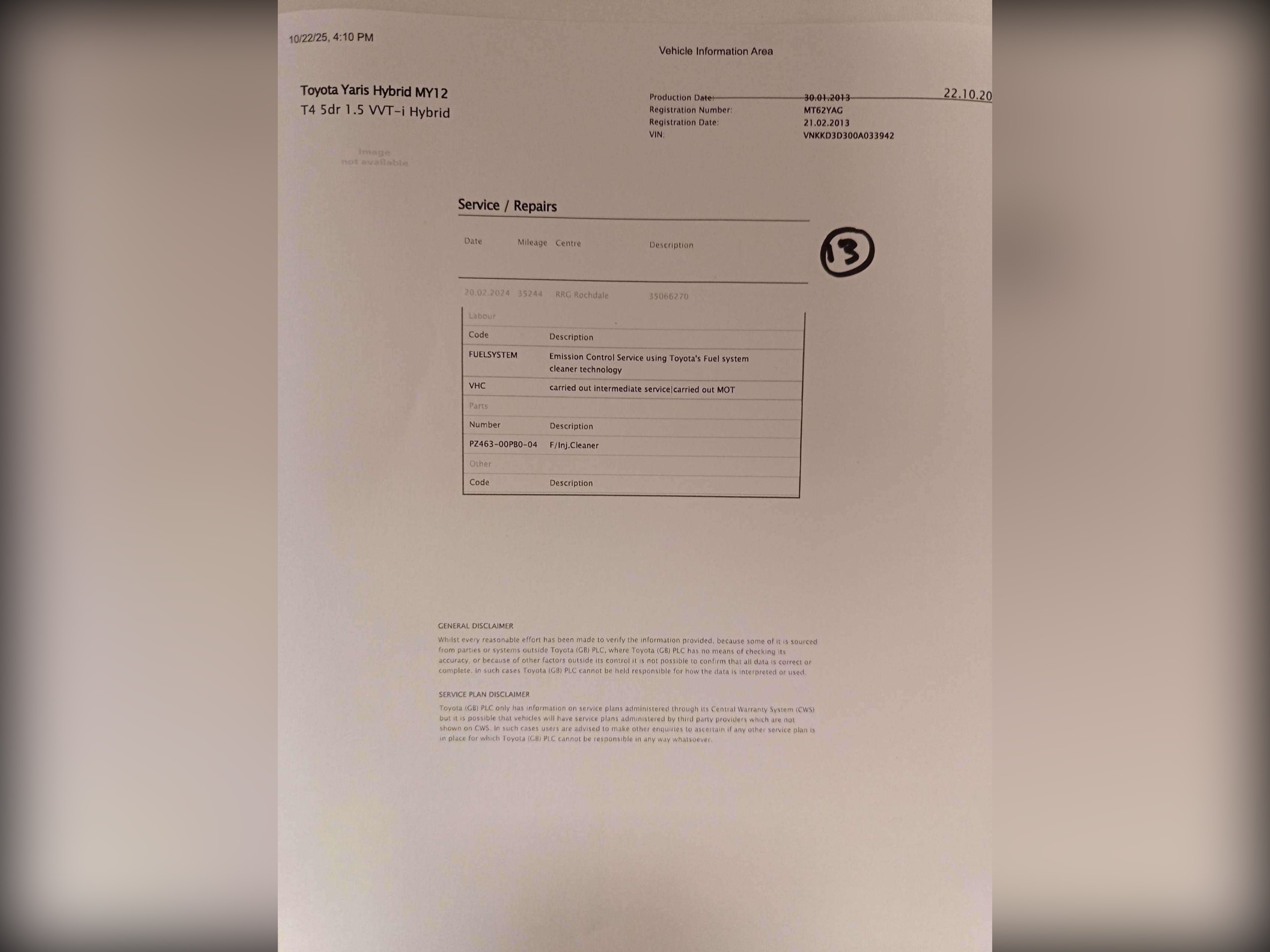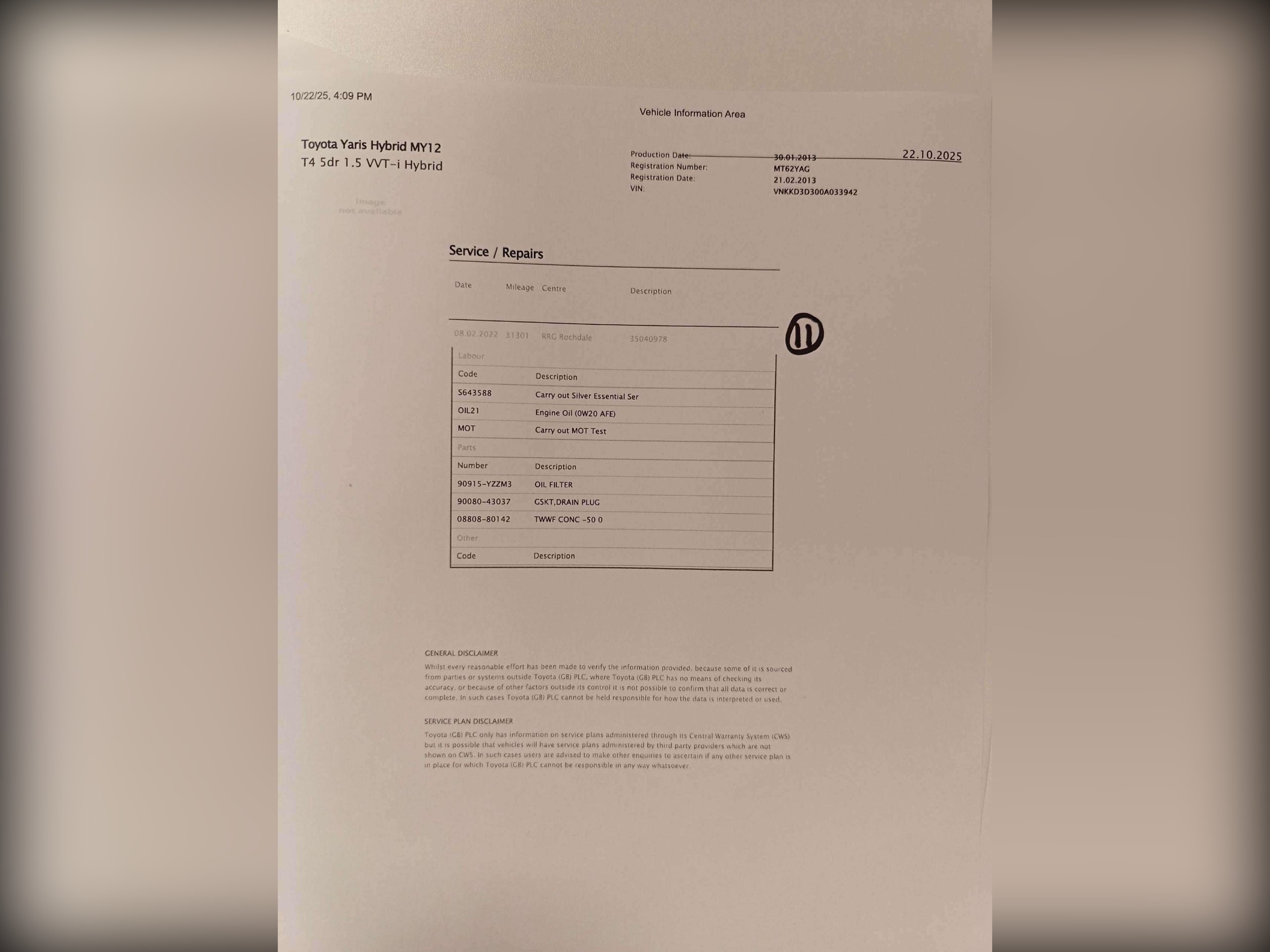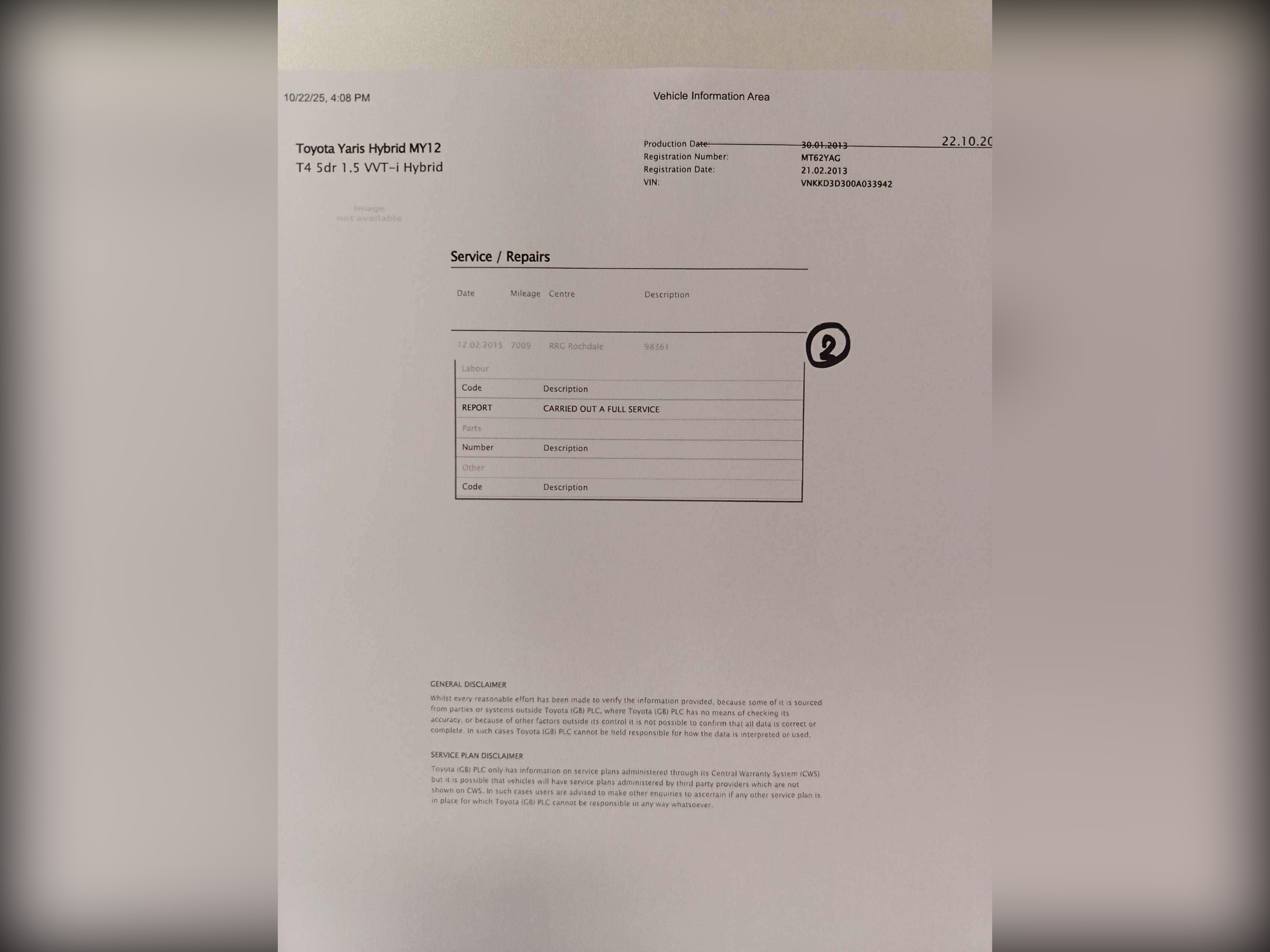 Hybrid/Cam/F Toyota Service History, 12 stamps from Toyota, One Owner since new and excellent drive. -