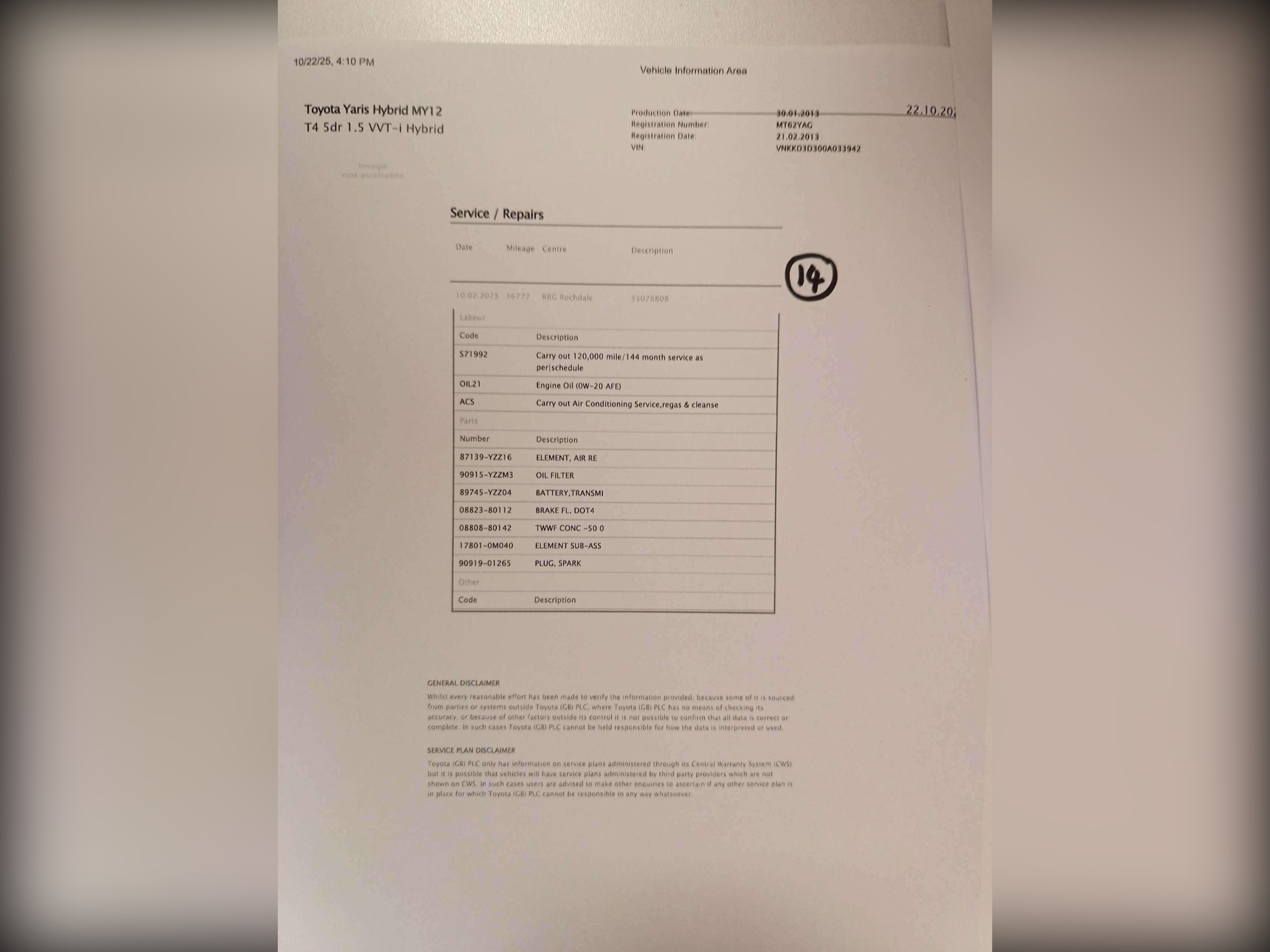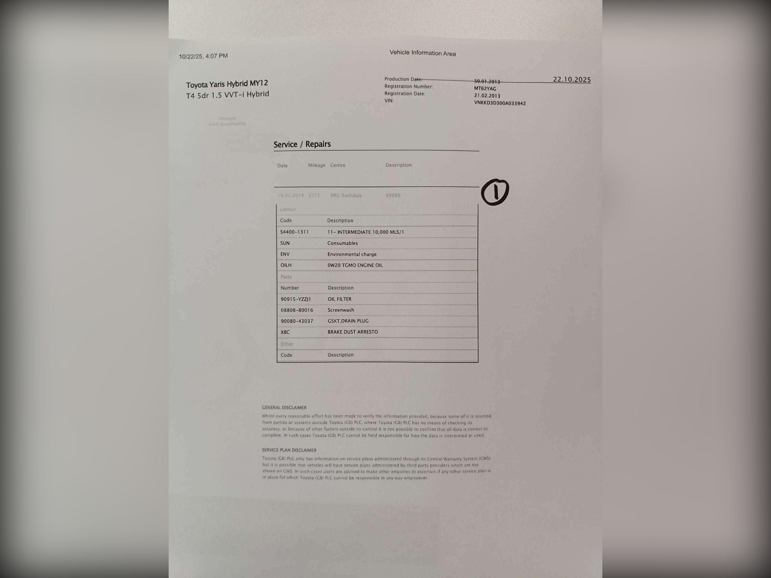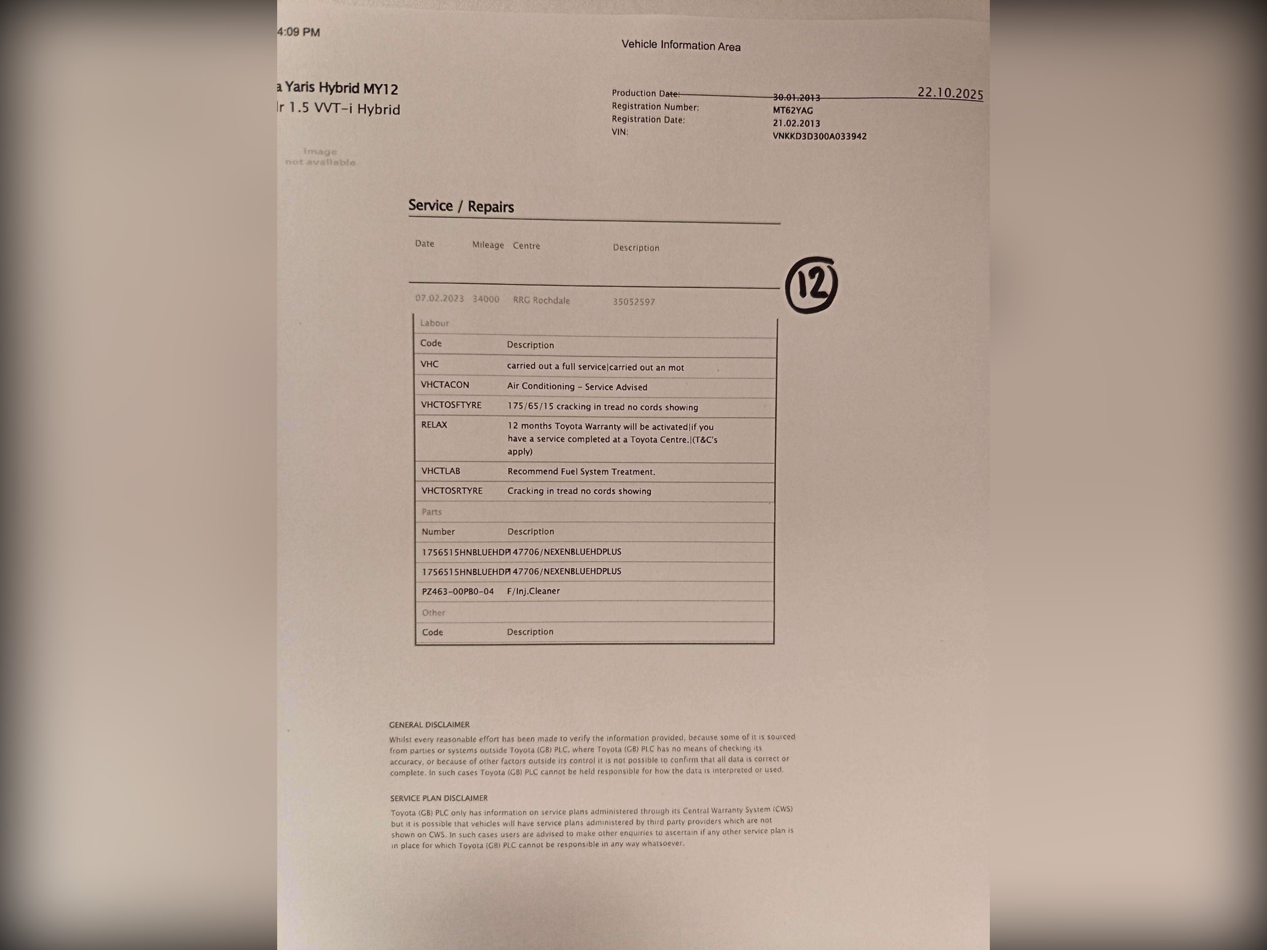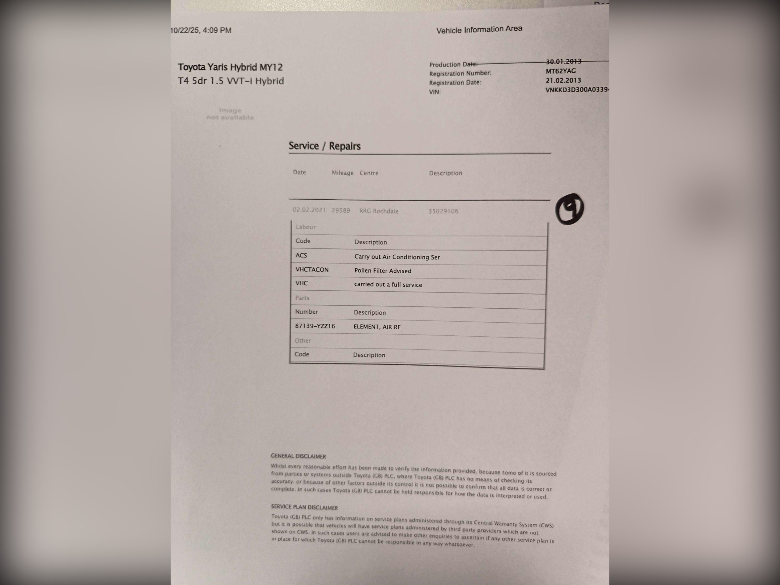 Hybrid/Cam/F Toyota Service History, 12 stamps from Toyota, One Owner since new and excellent drive. -